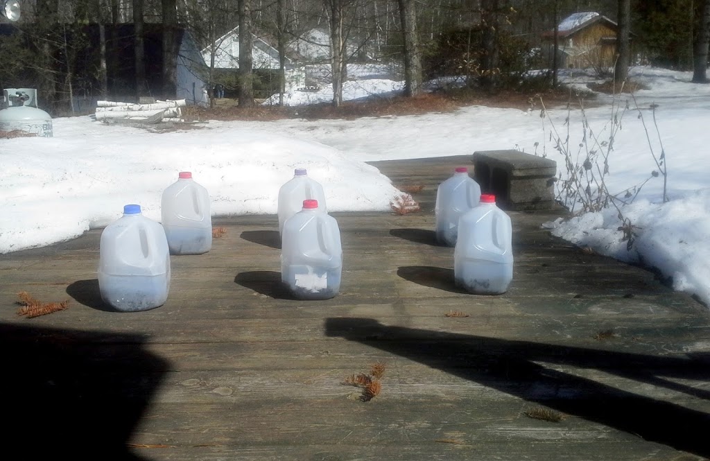 I read online how you can make little mini-greenhouses out of milk jugs (tutorial can be found here). I collected six milk jugs, washed them very well, then got to work. I planted them towards the end of March. I take them outside on sunny days as soon as it hits 40 degrees then I bring them in after dinner as their inside home is on my kitchen table.
